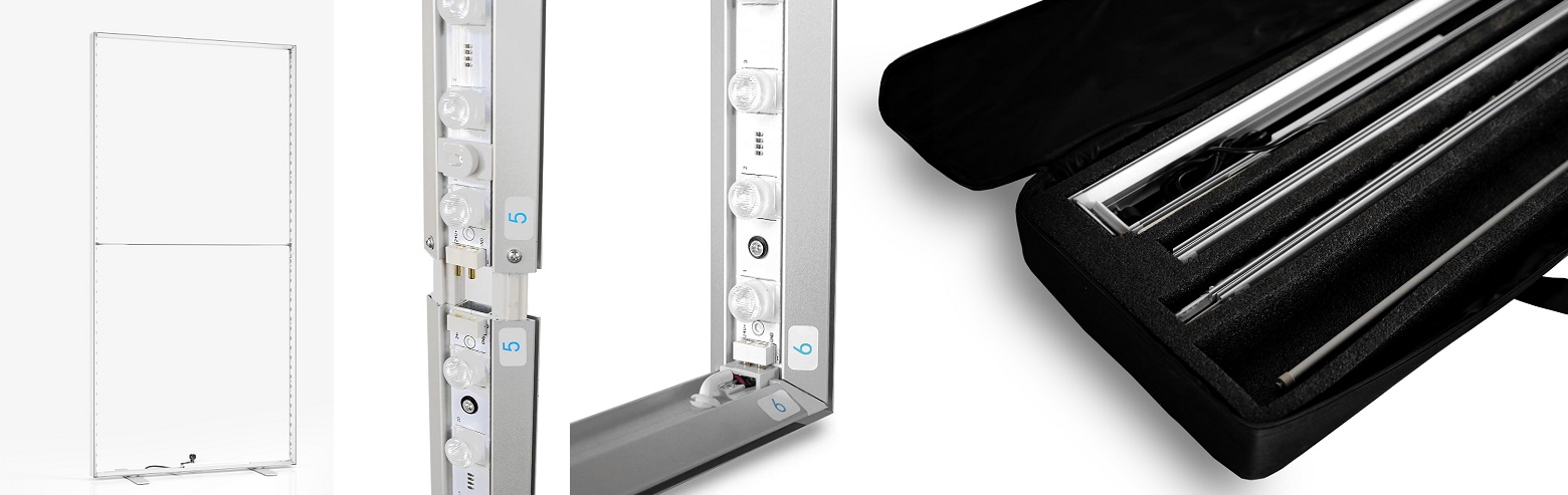 Superlicht textiel stretchdoek c.q. peesdoek frame (6,5 cm diep) met LED-verlichting in de zijprofielen en met dubbelzijdig full colour backlit B1 stretchdoek. De uitlichting is super. Het lichtgewicht (10 kg) aluminium frame klikt u zonder gereedschap in enkele minuten in elkaar en natuurlijk weer uit elkaar. Ideaal voor snelle presentaties en door het gewicht ook ideaal om mee te nemen. Compleet met stabiele voeten en direct aansluitklaar. Full colour print op stretchtextiel met B1 brandvertragende eigenschap en inclusief confectie met gummi lip of pees. Voor de print dient u een drukklaar bestand aan te leveren. Drukbestand kunnen wij ook voor u opmaken. Bij aanleveren van het drukbestand controleren wij deze uitvoerig en voor wij gaan printen ontvangt u een printproef die u moet goedkeuren. Levering inclusief handige draagtas. Optie: losse prints voor als u een keer wilt wisselen. Zie voor meer info bijgevoegde video. Zie voor opmaak printbestand bijgevoegde PDF.