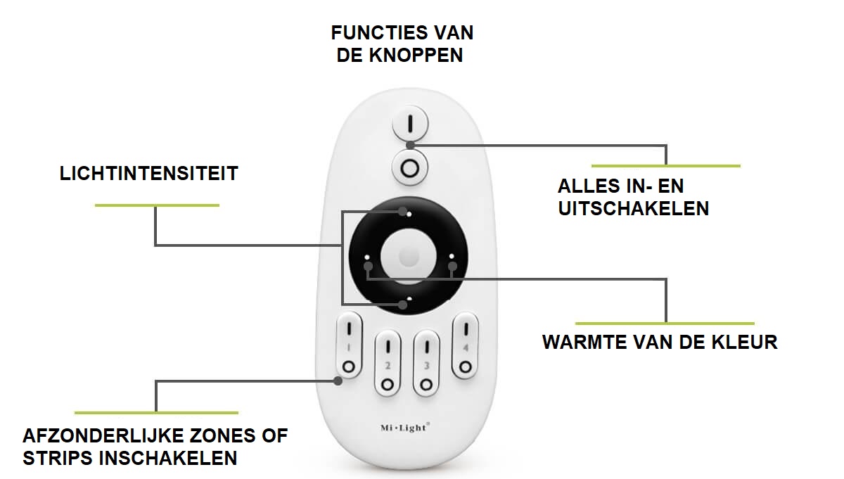 Eenvoudige LED afstandsbediening met 4 vrije groepen voor aan en uitzetten, dimmen en variabel instellen van de lichtwarmte. Bereik is 30 m. Werkt alleen i.c.m. een controler. Wordt geleverd exclusief benodigde AAA batterijen.